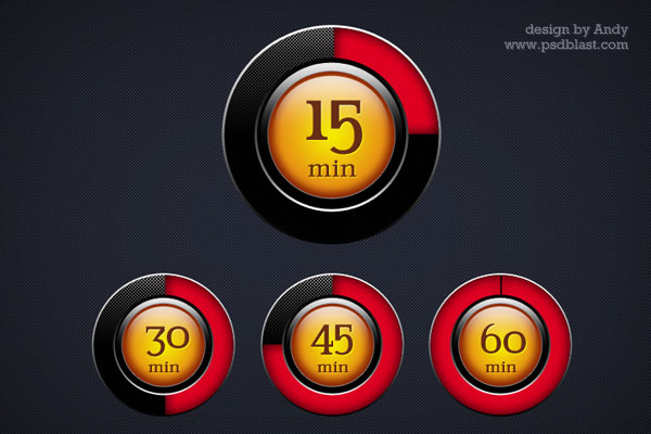 Red and black color glossy timer PSD file based on vector shaped layered. 4 set of timer icons color and size can be changed easily.